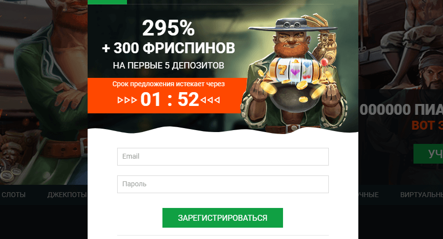 При первом пополнении счёта можно получить 105% от внесенных денег (но не более 15000 рублей). Или в качестве альтернативы забрать 35 бесплатных вращений. Обращайте внимание на вейджер и срок действия. Это предложение активно в течение пяти дней от момента регистрации.