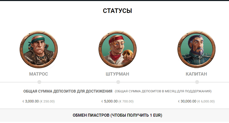 Необходимо отдать должное юмористическому подходу разработчиков, даже ступеньки лояльности поддерживают морские традиции. Новичок будет зачислен в казино Матросом, а дальше можно строить карьеру Штурмана, Капитана и Адмирала. Статус повышается по мере активности и размера ставок.