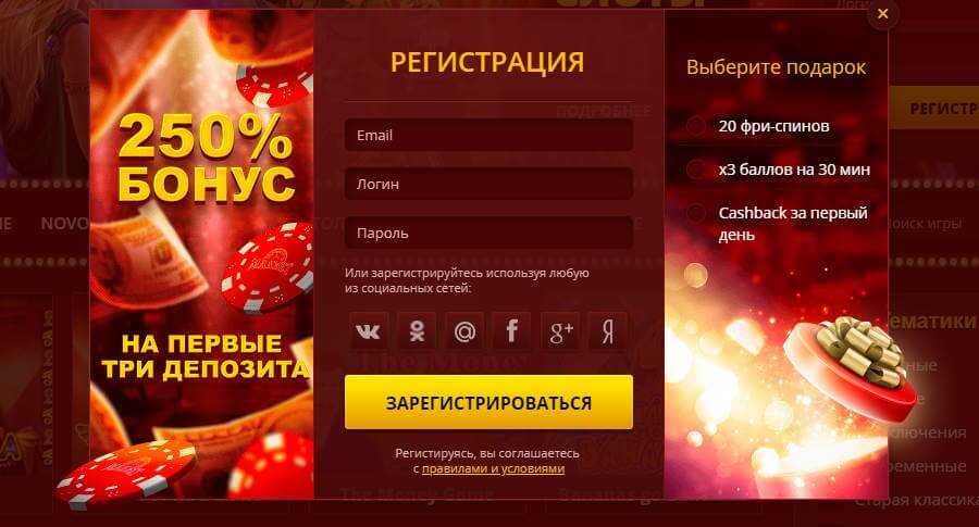 Процесс занимает не более минуты и имеет два вида. Это «обычная регистрация», когда Вас попросят сообщить адрес своей электронной почты и пароль (его нужно будет подтвердить), а также «регистрация через социальную сеть». Для второго вида достаточно лишь кликнуть на значок той соцсети, в которой зарегистрирован игрок. Казино предлагает на выбор следующие из них: ВК, Одноклассники, MailRU, Yandex, Google+, Facebook. После регистрации игровые автоматы на деньги еще не будут доступны, так как для этого сперва необходимо пополнить счет.