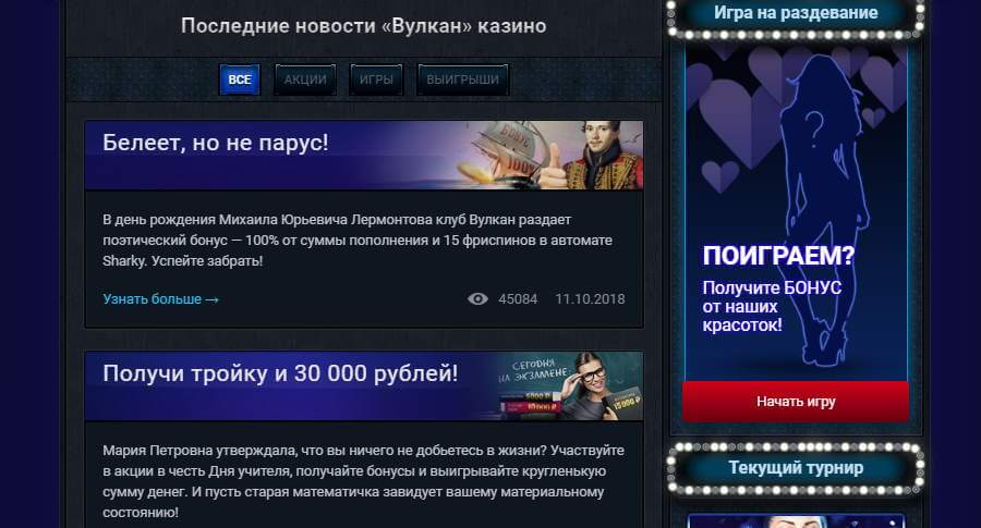 Стилистика официального сайта Вулкана выдержана в ярком стиле с большим наличием баннеров
