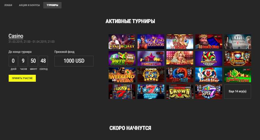 Доступен блэкджек американской, европейской и других разновидностей; poker, кено. Регулярно проводятся акции, турниры и розыгрыши лотерей.